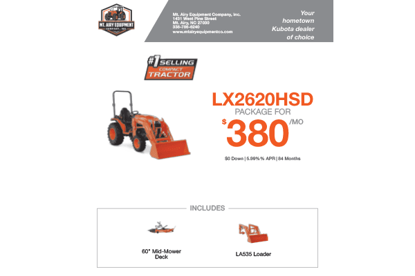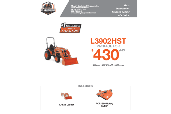 Mt. Airy Equipment Co., Inc. opened its doors in 2000 and has successfully been running under the same ownership and management ever since that time. Through our loyal customer base and employees, we are now one of the largest dealers in the Southeast. Our company has always strived to offer the highest quality products, such as Kubota, Massey-Ferguson, Gehl, Taylor-Way, Bush Hog, and others. We deal-in the best consumer offered brands of equipment to our customers to guarantee their satisfaction. Our Mission is to provide our customers with the highest quality equipment at the best possible prices, while going above and beyond surpassing the customers’ expectations. Our company cherishes our family-oriented culture and our friendly/supportive staff. With our town’s historical background, we are continuously supporting and giving back to the community. We are a full-service company with an efficient Parts and Service Department.